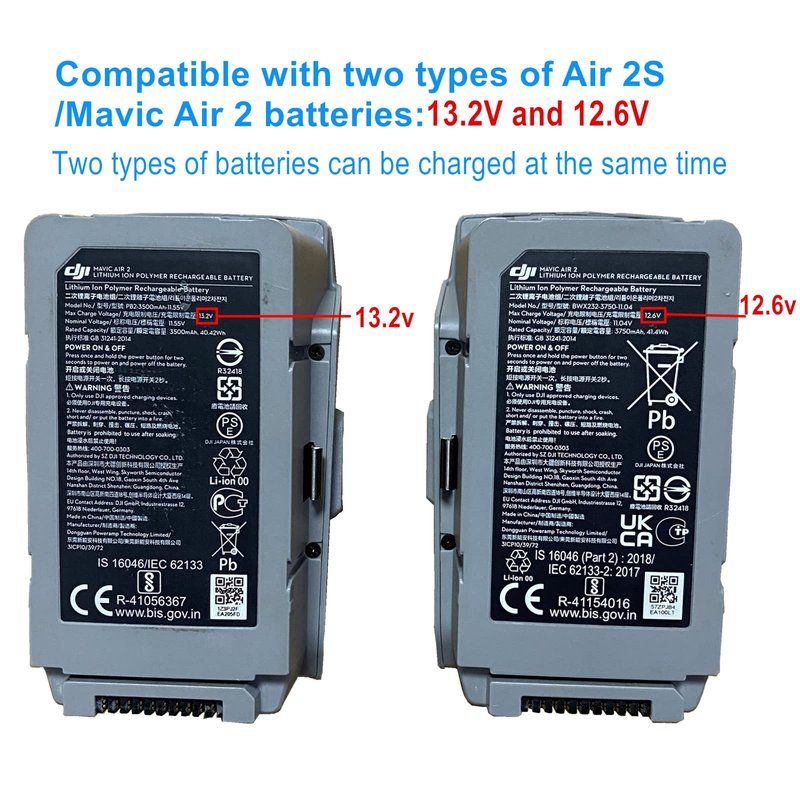 - Specially designed for 13.2v and 12.6v DJI Air 2S & Mavic Air 2 battery. Two types of batteries can be charged at the same time, The charger automatically matches the voltage