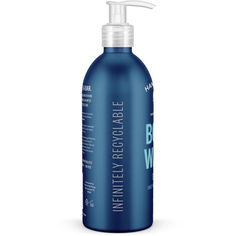 Sweet mint & eucalyptus. Vegan. Sustainable suds. Palm oil free. No palm oil. No parabens. No phthalates. No SLS/SLES. No BHT. No EDTA. No pegs. handinhandsoap.com. Buy a bar. Give a bar. For every product purchased, hand in hand donates one bar of soap and clean water to a child in need across the globe. 100% of our donation go to developing communities. To learn more about the impact of your purchase visit handinhandsoap.com. Sustainable suds in sustainable packaging. This pretty bottle is made of infinitely recyclable aluminum. Infinitely recyclable. Recyclable. Refillable. Reusable. Cruelty-free. Made in the USA.
