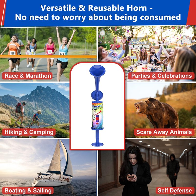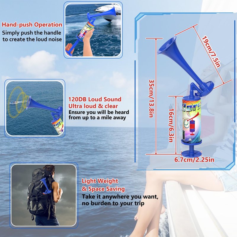 - Portable and Travel-Friendly: Designed with a compact size, our hand push air horn is incredibly convenient to carry while you're on the go. It easily fits into travel bags, backpacks, handbags, and more. Whether you find yourself trapped in the wilderness or in need of assistance, simply press the horn to signal your precise location to passersby or law enforcement, ensuring a swift and efficient rescue.
