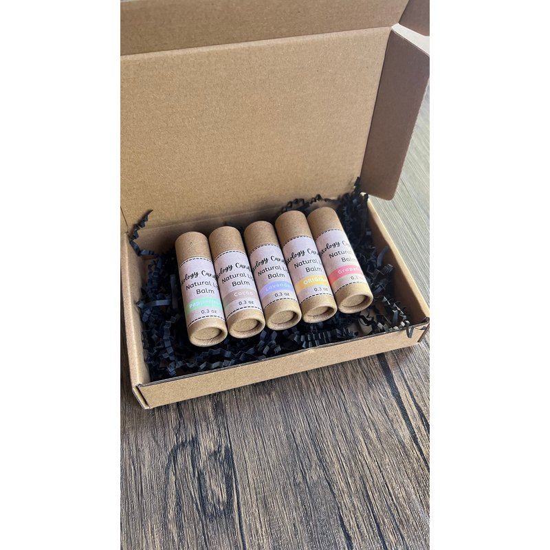 Our handmade Natural Lip Balm Set features five amazing flavors: Original, Mint, Cocoa, Lavender, and Grapefruit. Made with only natural ingredients and oils, our lip balm is free from synthetic fragrances, dyes, and preservatives. Packaged in a cardboard tube, it's the perfect eco-friendly addition to your daily routine. 100% Natural Ingredients: Our lip balm is made with only natural ingredients, including natural oils, to help nourish and protect your lips. Five Delicious Flavors: Enjoy a variety of flavors to suit your mood and preference - Original, Mint, Cocoa, Lavender, and Grapefruit. Eco-Friendly Packaging: Our lip balm is packaged in a cardboard tube, which is recyclable and helps reduce plastic waste. Moisturizing and Nourishing: Our lip balm is designed to keep your lips moisturized and nourished, with ingredients like cocoa butter, shea butter, and beeswax. Perfect for All Seasons: Whether it's hot or cold outside, our lip balm is perfect for keeping your lips soft and smooth all year round. Ingredients: Original: Beeswax, Coconut Oil, Sweet Almond Oil, Cocoa Butter, Shea Butter, Vitamin E, Mint: Beeswax, Coconut Oil, Sweet Almond Oil, Cocoa Butter, Shea Butter, Vitamin E, Essential Oil Blend (Peppermint, Spearmint) Cocoa: Beeswax, Coconut Oil, Sweet Almond Oil, Cocoa Butter, Shea Butter, Vitamin E, Cocoa Powder Lavender: Beeswax, Coconut Oil, Sweet Almond Oil, Cocoa Butter, Shea Butter, Vitamin E, Essential Oil Blend (Lavender) Grapefruit: Beeswax, Coconut Oil, Sweet Almond Oil, Cocoa Butter, Shea Butter, Vitamin E, Essential Oil Blend (Grapefruit) Directions: Apply to lips as needed to keep them moisturized and nourished. Caution: For external use only. Discontinue use if irritation occurs. Avoid contact with eyes. Keep out of reach of children. Order now and experience the natural goodness and delicious flavors of our Natural Lip Balm Set!