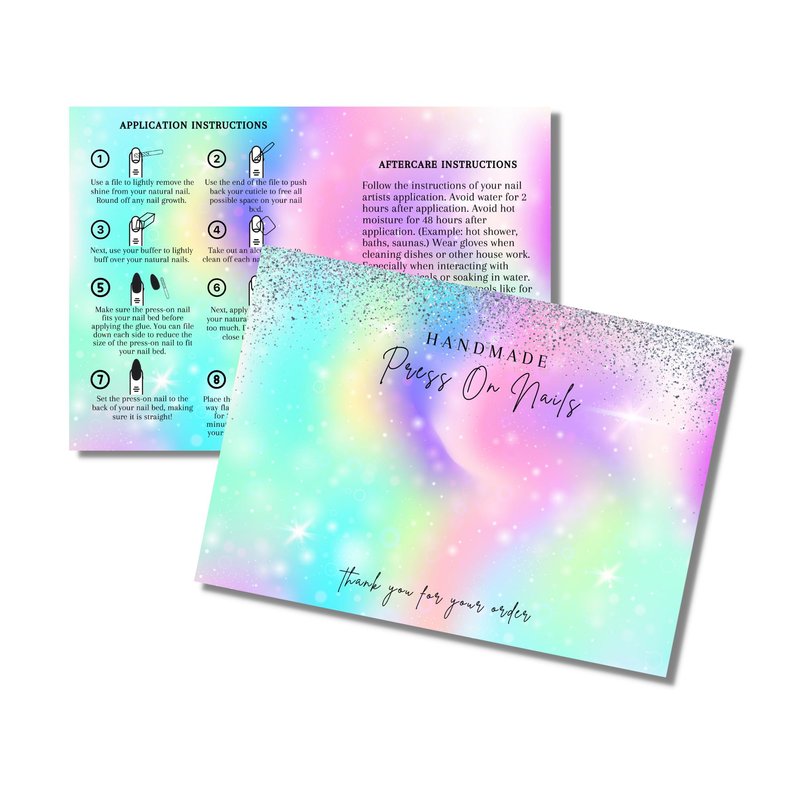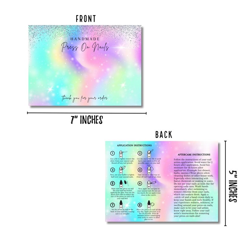 - Great Bulk Quantity: 30 pack of faux holographic 5x7” postcards. The front has a great space for different sizes of unique, handmade nails. The application instruction and aftercare instructions are on the back. These include sleek icons and detailed, easy to follow instructions. Remember: design is intended to look like rainbow and is NOT reflective or actually holographic!