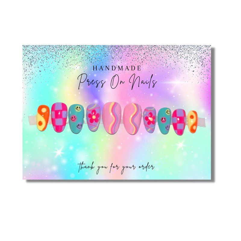 Use these to double sided tape your handmade custom ordered press on nails to before you ship them and package them up to your clients. They work great inserted into a holographic bag about a 6 x 9” size bag so they can display your press on nails. The design is a faux holographic print that is great to add your customized nails on to for your clients.