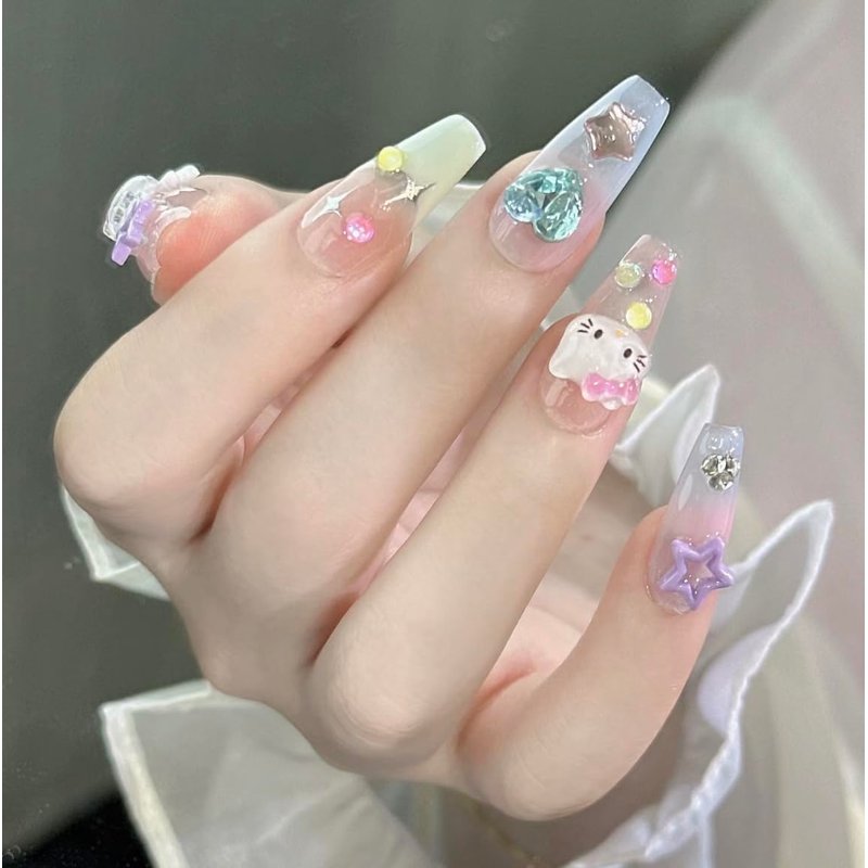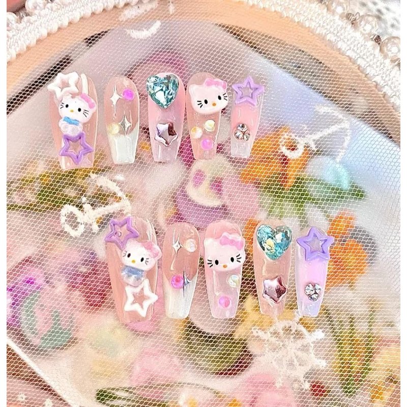 Handmade Press on Nails Medium Coffin - Cute Kawaii Cartoon Y2K 3D Cartoon Cat Design 10Pcs(S)
