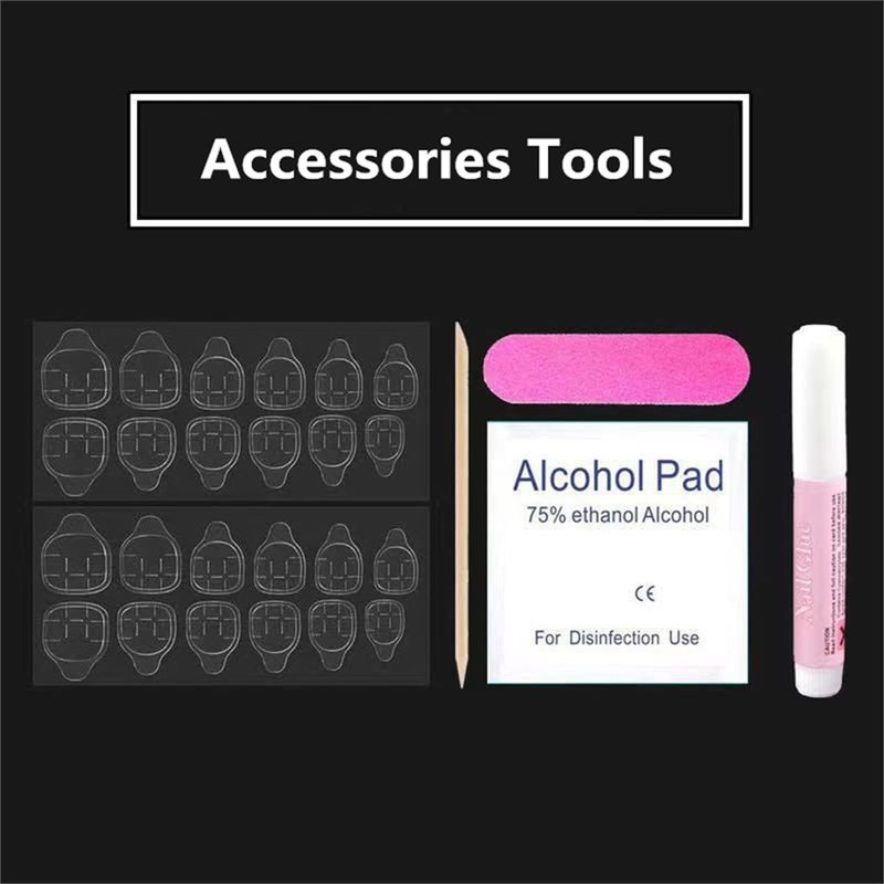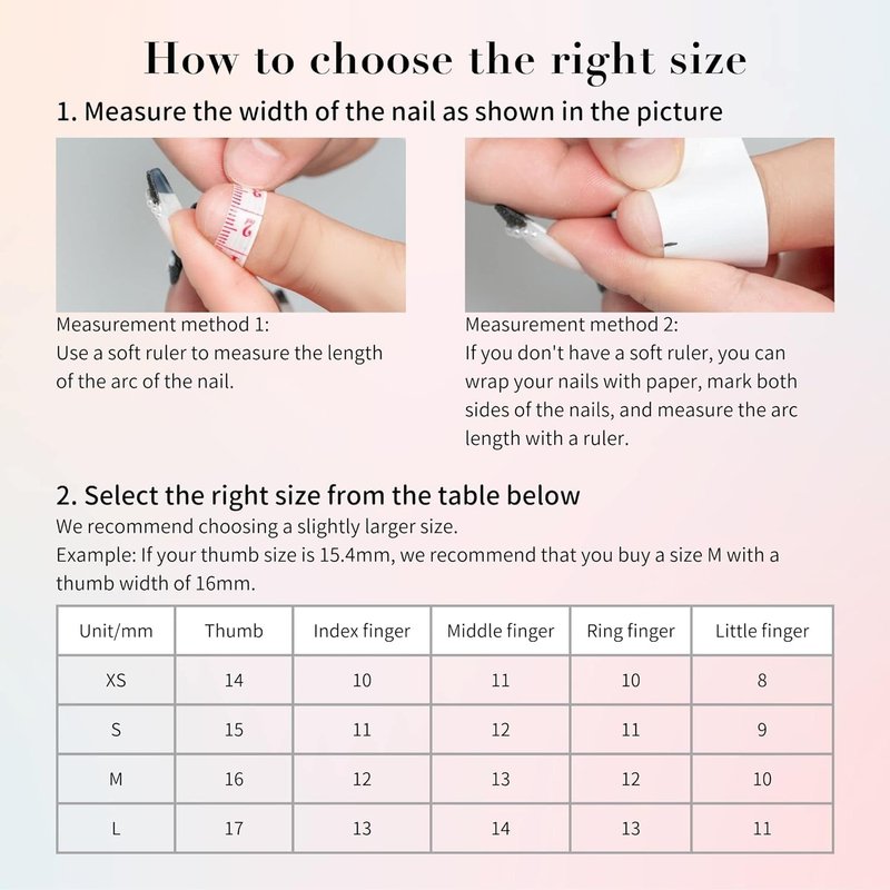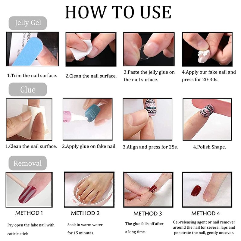 - What You will get:Press-on nails (10 pcs), nail tabs (24 pcs), a nail remover stick, a nail file, and a storage box. ※Please refer to the product picture for how to measure and choose the size. ※It is recommended to use the jelly glue recommended below for the best results and reusability.
