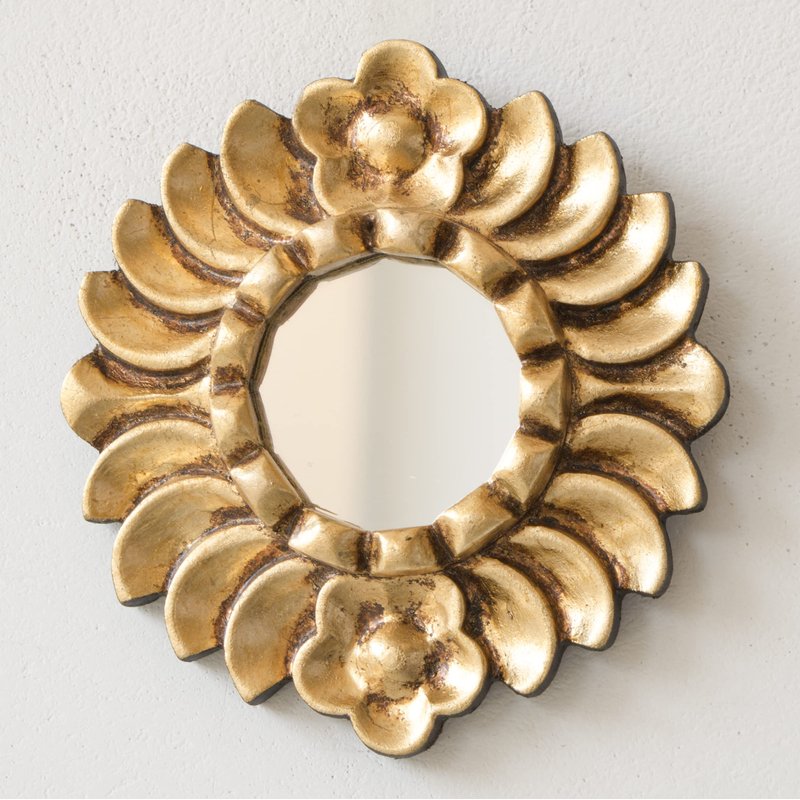 A mirror inspired by the flowers where they shines radiantly, illuminating the home with rays of golden light. Spectacular mirror in hand-carved mohena wood covered in gold leaf. The peruvian art of painted glass (Cusco style) is reflected in these spectaculars handmade mirrors by peruvian artisan Edmundo Contreras. This Handmade mirror is a perfect gift for her, best friend and an ideal and unique accent piece for the home décor, office decor or farmhouse decor. Measures 6"Hx6"Wx0.5"D .
