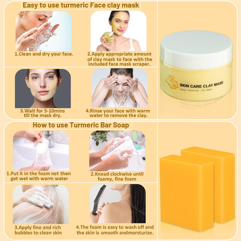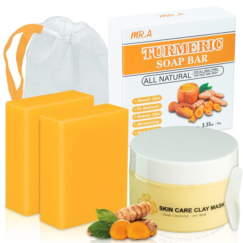 - Suitable for All Skin Types Tumeric Bar Soap: 2*3.35oz turmeric body wash soap & 1*4.23oz turmeric clay mask is really good for all skin types. It is mild and hydrating, moisturizing. Firstly, after cleaning your face, apply appropriate amount of clay mask to your face with the included face mask scraper. Secondly, wash your body with turmeric soap bar. Thirdly, wash your face with clean water. Please enjoy your spa at home with Mr. A turmeric series.
