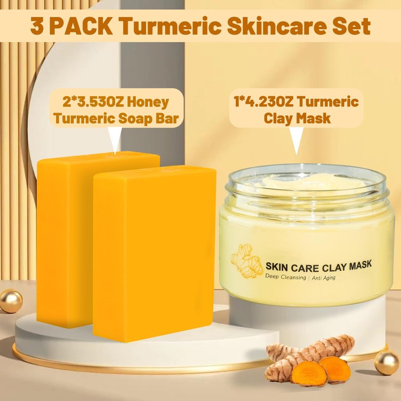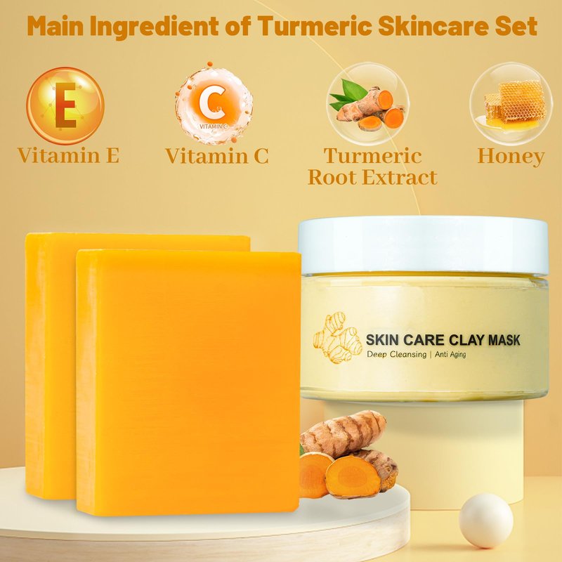 Handmade Turmeric Soap Bar Turmeric Face Clay Mask skincare Set, 1 Pack Vitamin C Facial Mask Overnight Face Mask for Pores, 2 Pack Honey Vitamin E Tumeric Soap for Face Body