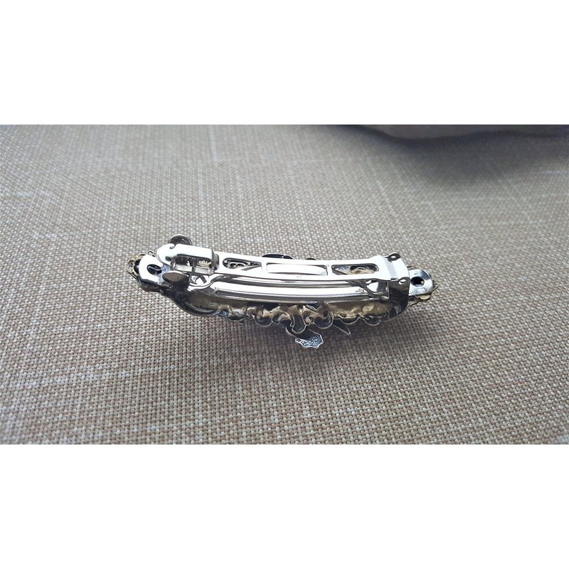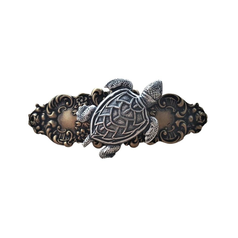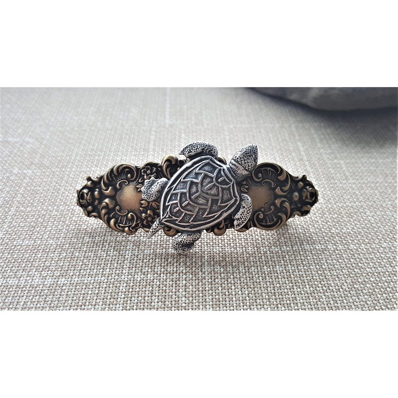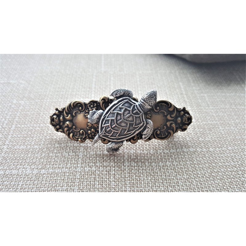 *High quality silver plated brass hair clip. *Oxidized Brass.ornate stamping *Oxidized silver Turtle *Velvet drawstring gift pouch Measures: 1" x 2 1/2"