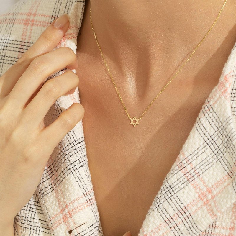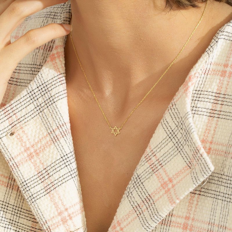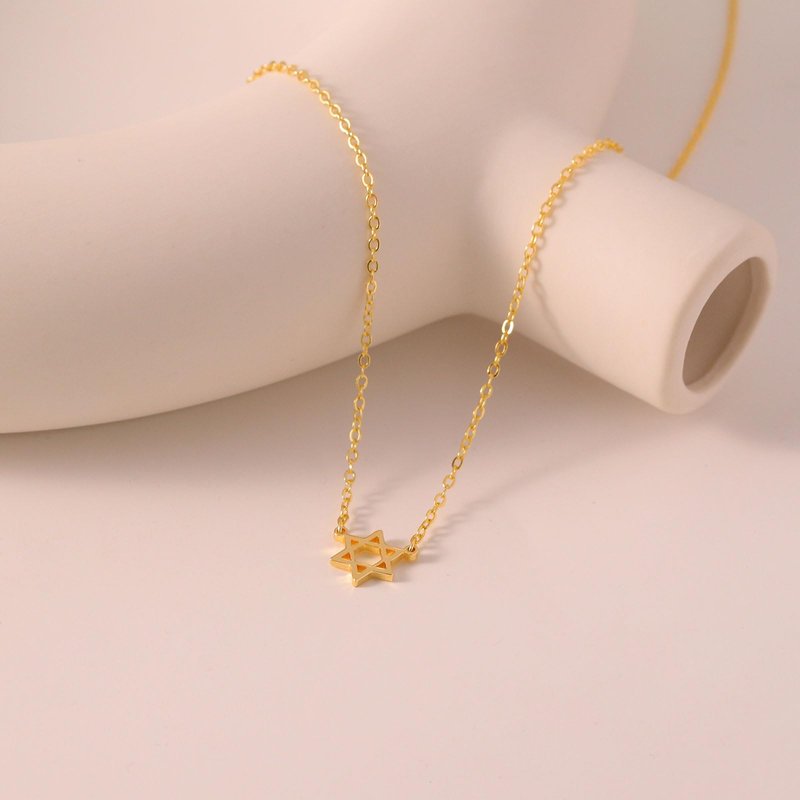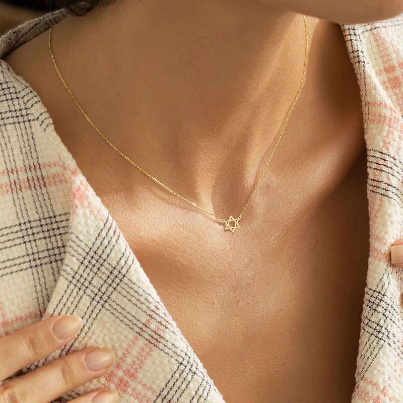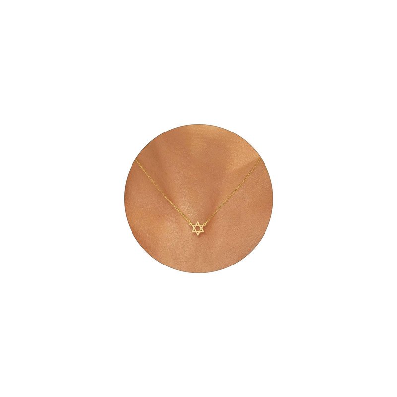 - GOLD NECKLACE SIZE: This star of david jewelry chain length:16.5''+2'', pendant size: 10mm. A simple hexagram, a Star of David, to make a lovely everyday necklace to wear next to your skin and carry with you through life.
