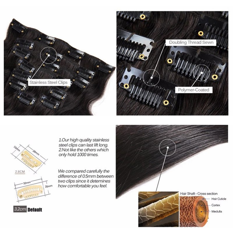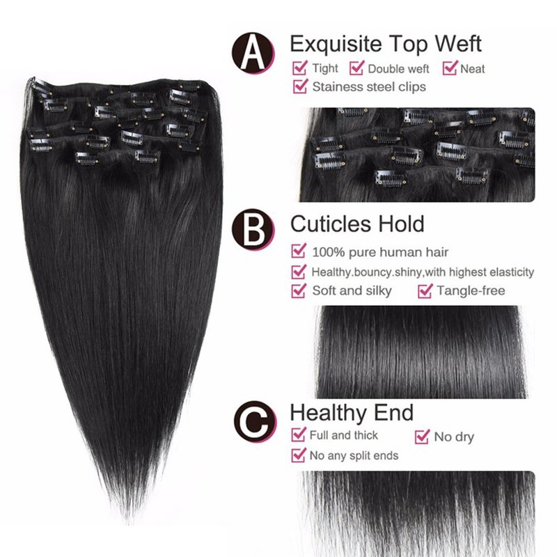 - Hair Weave:Brazilian Straight Clip in Human Hair ,Natural Black Color #1B,Jet-Black Color #1