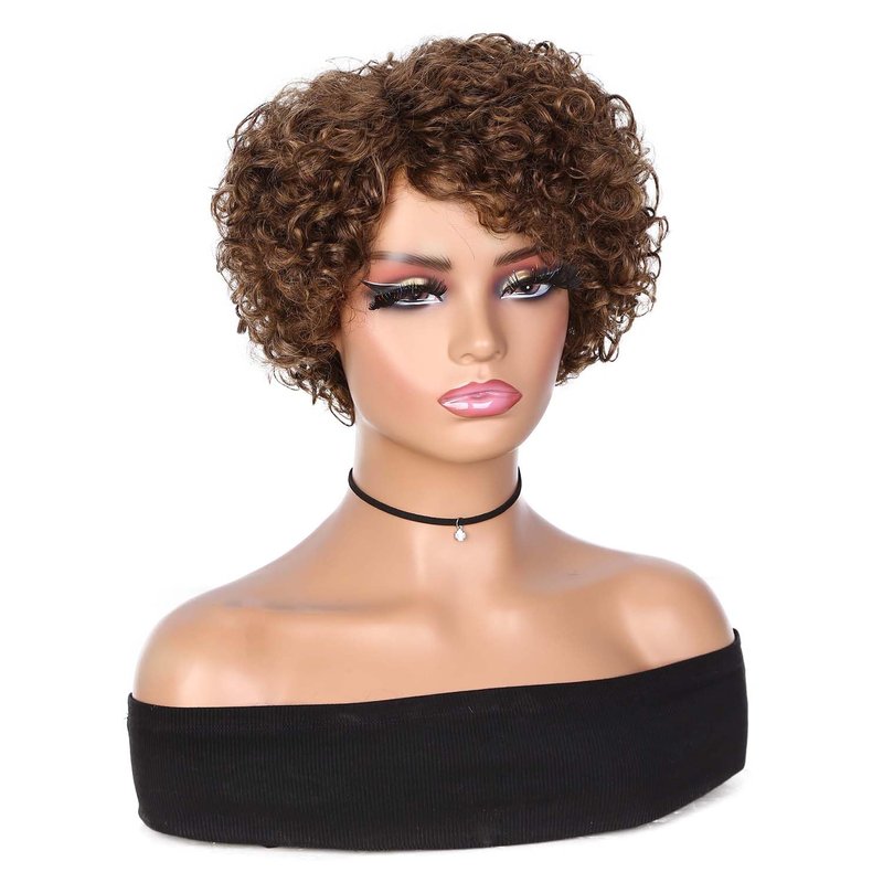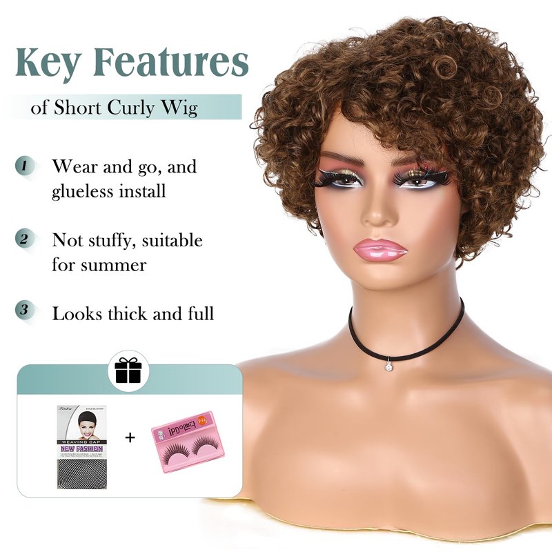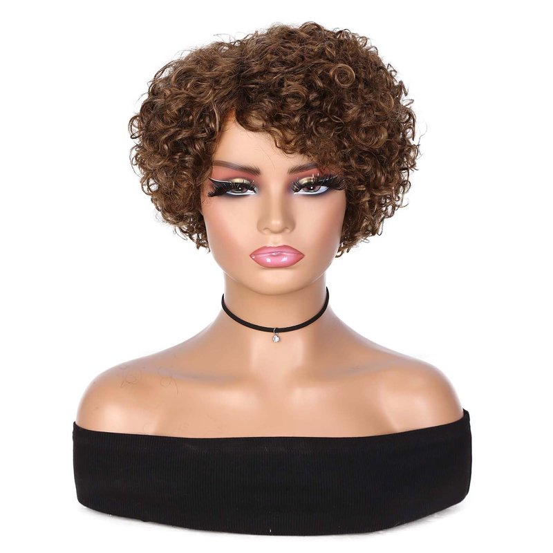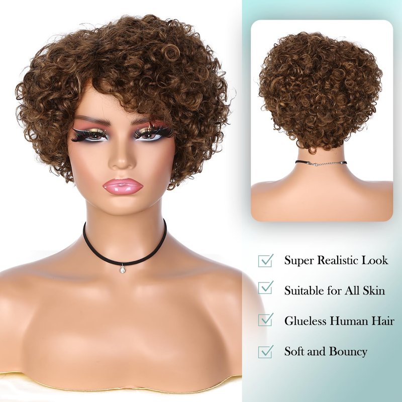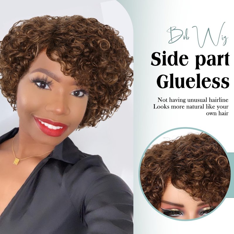 Hanne Fashion Short Curly Human Hair Wig for Black Women Brown Curly Bob Wigs Side Part Pixie Cut Wig Brazilian Remy Human Hair Non Lace Glueless Wigs (F4/30)