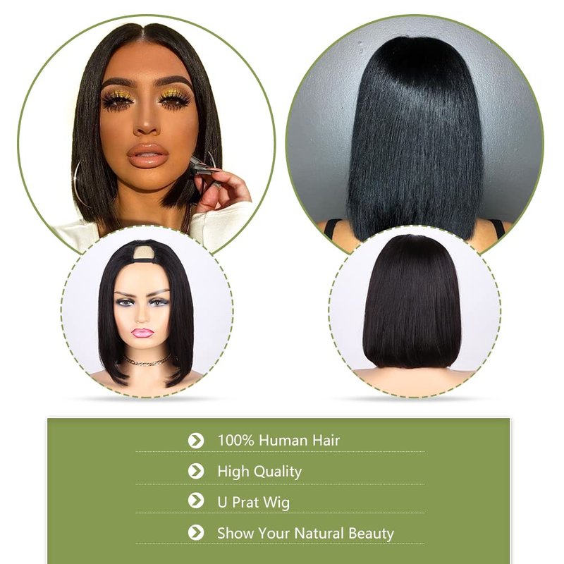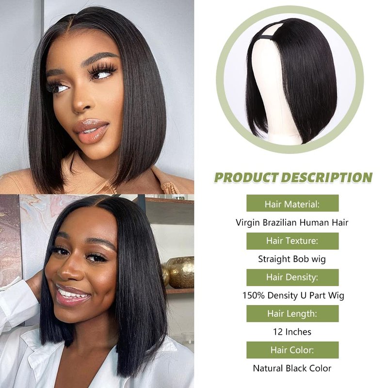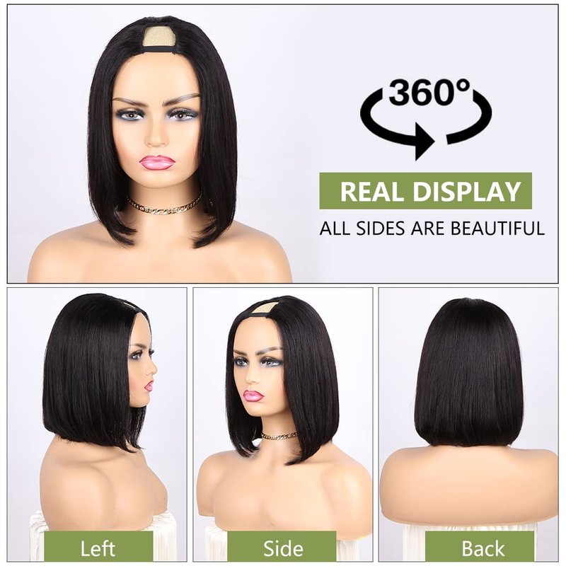 Hanne Fashion U Part Wig Human Hair Straight Short Bob Wigs for Black Women No Leave Out No Glue No Sewing U Part Bob Wigs Natural Black