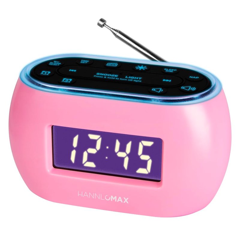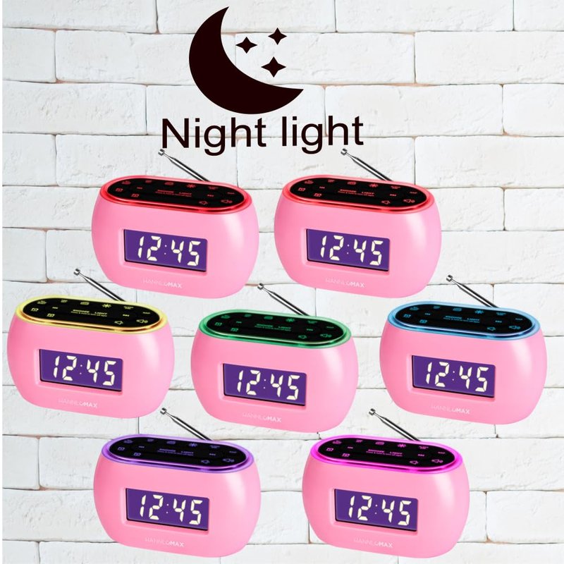 HANNLOMAX HX-161CR Portable PLL FM Radio Alarm Clock, LCD Display with Dimmer Function, 7 Colors RGB Night Light, USB Port for 1A Charging, Telescopic Antenna, AC/DC Operation only. (Pink)
