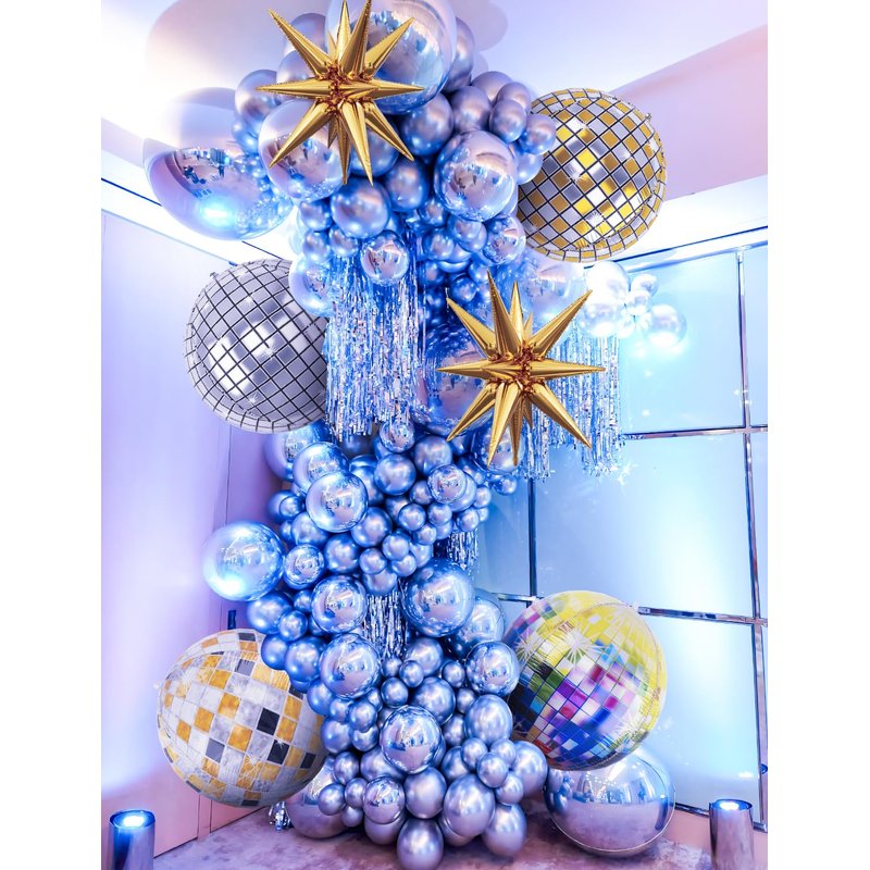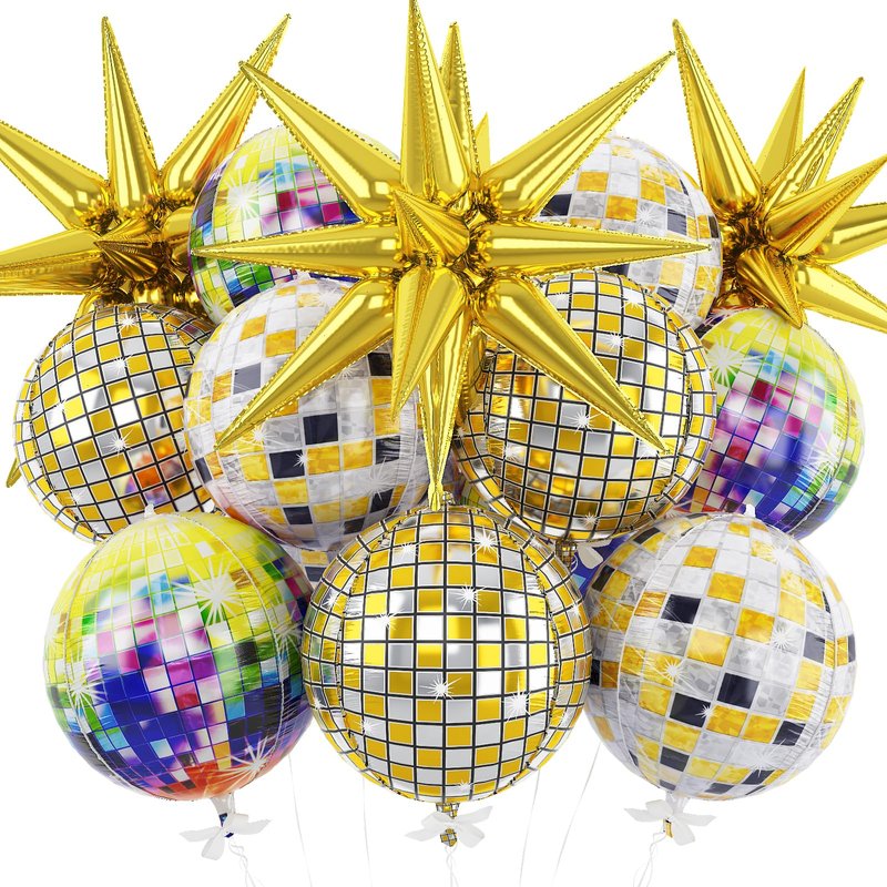 Bring the dazzling atmosphere of a disco party to your celebrations with these Haolongfa Disco Ball Balloons! This set of 12 large, shiny balloons features a mesmerizing 4D holographic design that reflects light in a captivating, colorful display. Crafted from high-quality Mylar material, these balloons maintain their shape and shine for an extended period. Inflate them with helium for an eye-catching, floating decoration or let them sit on tables and surfaces for a festive touch. With their striking gold spike explosion star pattern, these balloons instantly elevate the ambiance, making them perfect for Christmas, New Year's Eve, birthdays, or any special occasion. Measuring approximately 22 inches in diameter when inflated, these balloons create a bold, vibrant statement that will leave a lasting impression on your guests. Elevate your party decor with the shimmering radiance of these Haolongfa Disco Ball Balloons!