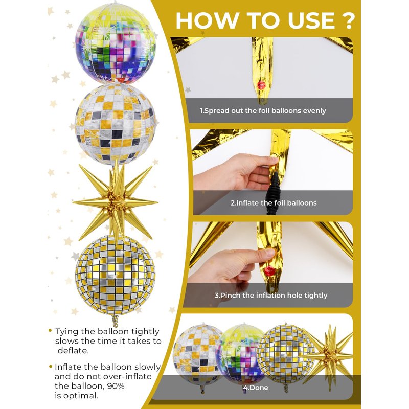 - 【Easy to Use】: These unique disco ball balloons for 70s parties are very simple to use. Insert an inflation pump or straw at the label position. Inflate the high-quality polyester film 4D balloons to 90% and they'll shine brightly. The air outlet seals automatically after inflation, no bundling needed. Simple and convenient, and reusable after deflation