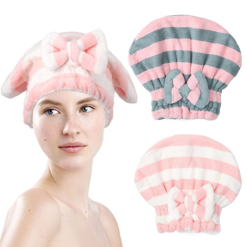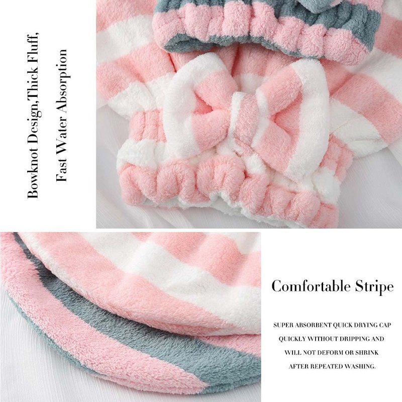 Haomye Microfiber Hair Dry Cap Absorbent Quick Drying Cap Soft Hair Drying Towel Stripe Dry Hair Cap Hair Towel Cap with Bow-Knot Shower Cap for Women and Girls 2Pcs (Pink Blue & Pink White)