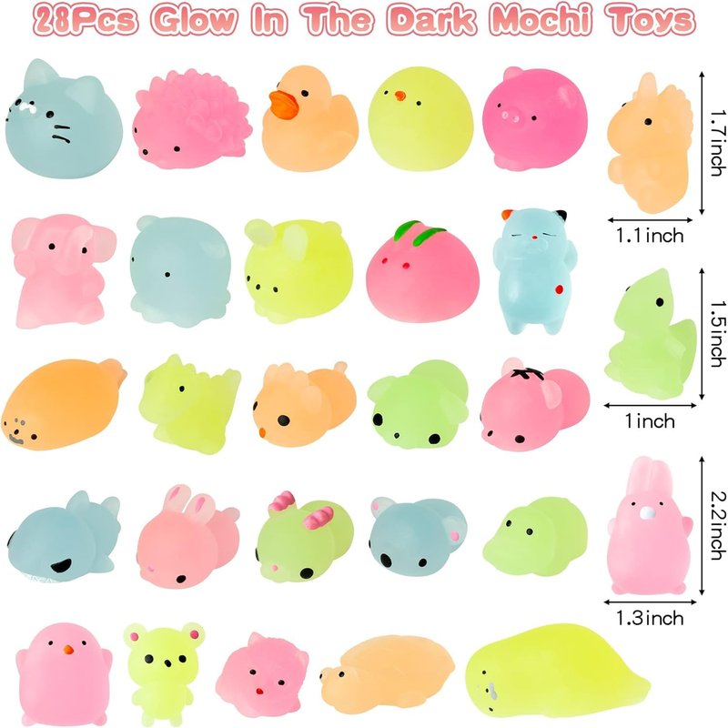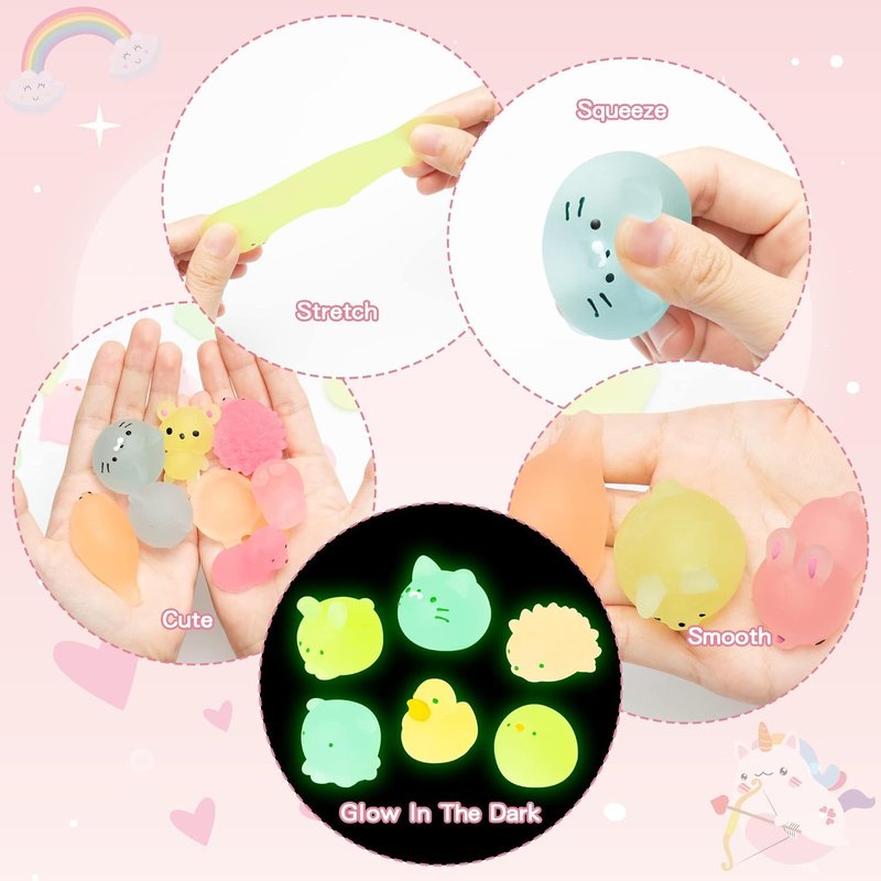 - Adorable Mochi Animal: These glow in the dark mochi toys come with cute animal design and bright color, each animal is super cute and soft to the touch, which will bring you an interesting tactile experience. (Note: Please put these squeeze toys in the sun or flashlight for 15 minutes, they will glows all night in the dark.)