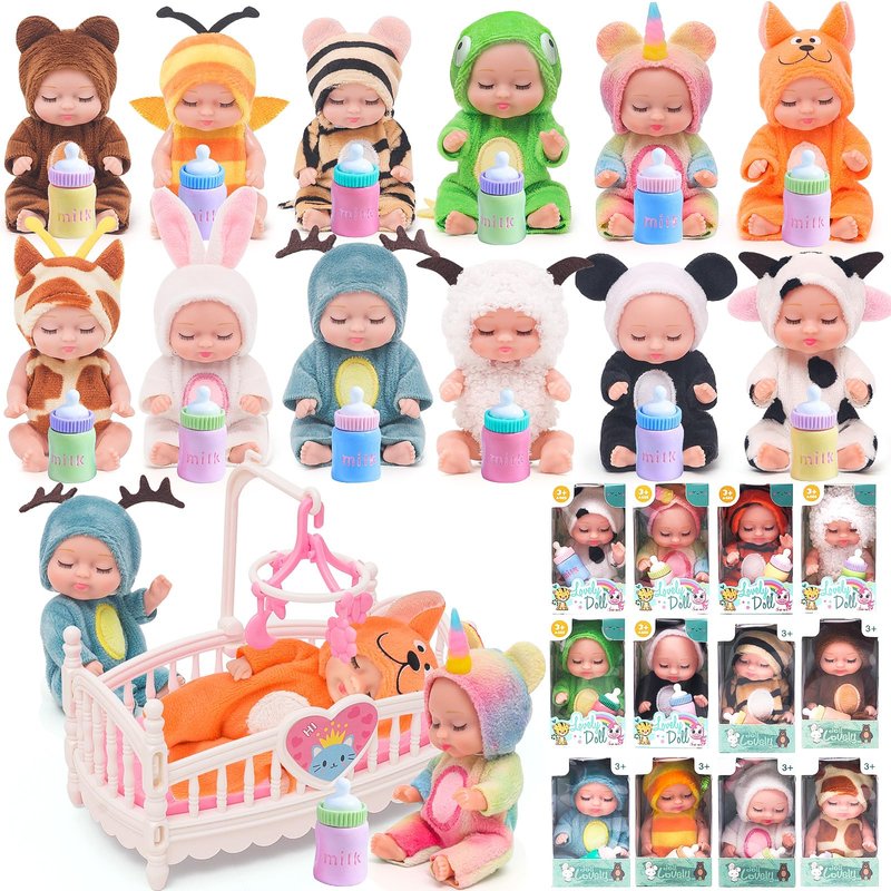 - EXCITING COMBINATION: You'll get 12 PCS 4 inch reborn baby dolls dressed in different cute animals outfits, each tiny baby doll is unique, rabbit, bee, bear, giraffe, elk, tiger, cow, fox, unicorn, dinosaur, sheep and panda, each one comes with a small colourful feeding bottle. The variety of shapes will make your children's eyes pop.
