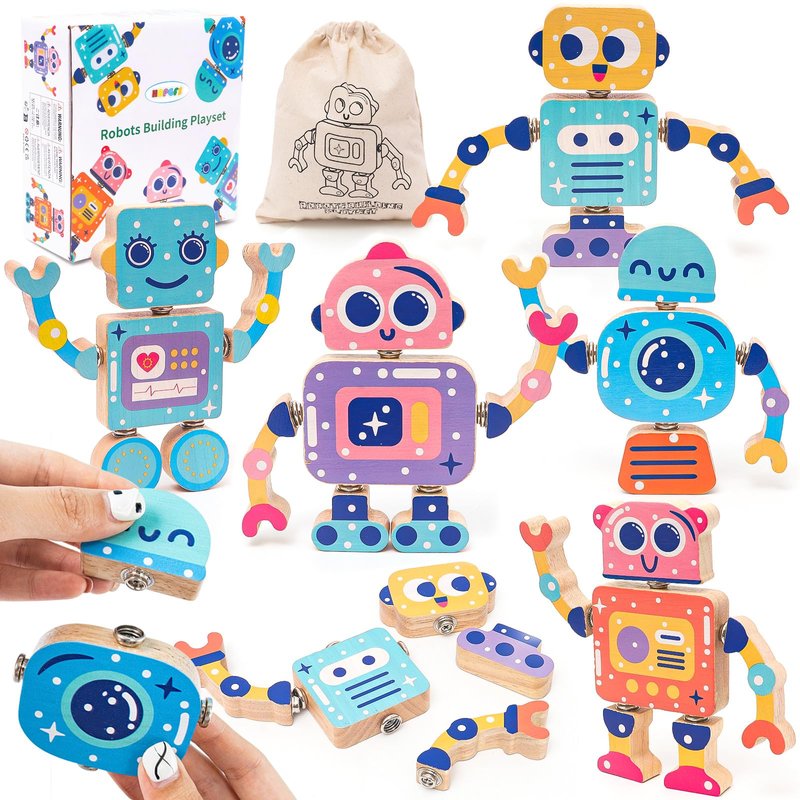 HAPGFS Wooden Robot Snap-Together Building Blocks, STEM Take Apart Toys Playset for Toddlers 3 4 5 6, 28 Psc Montessori Educational Fine Motor Skills Toys for Boys & Girls Birthday Gift