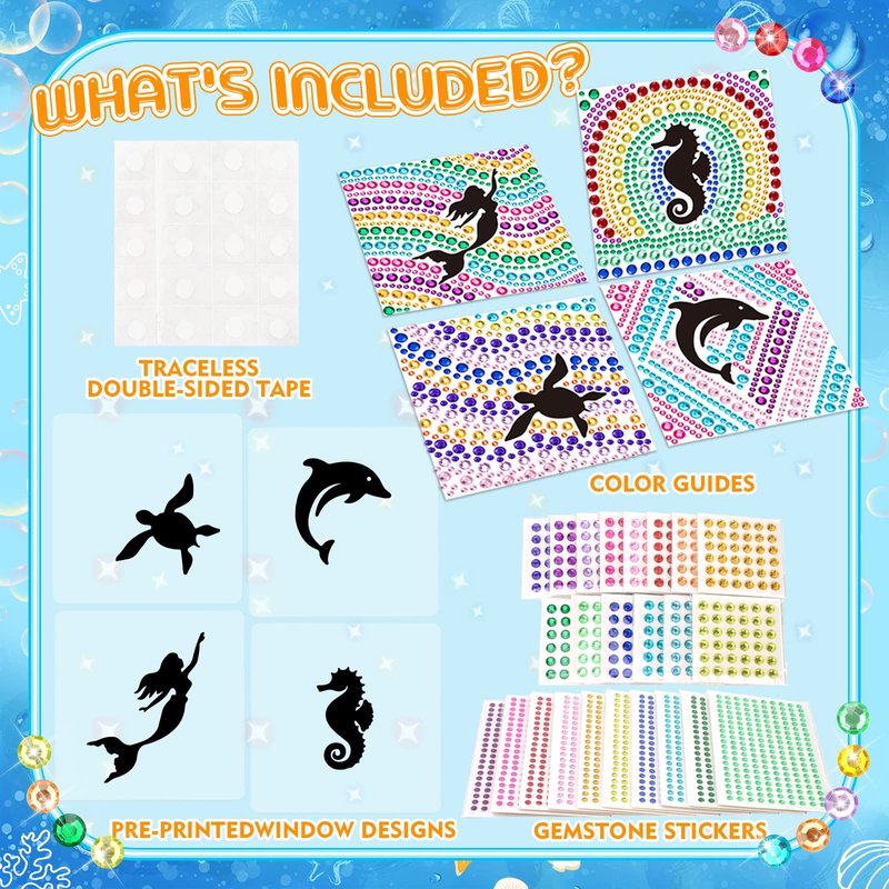 - All-inclusive kit: Contains all items needed to make the gem diamond painting kit. Include 4 pre-printed window designs, 4 color guides, double-sided tapes, and 14 large diamond stickers, 10 small diamond stickers are included..