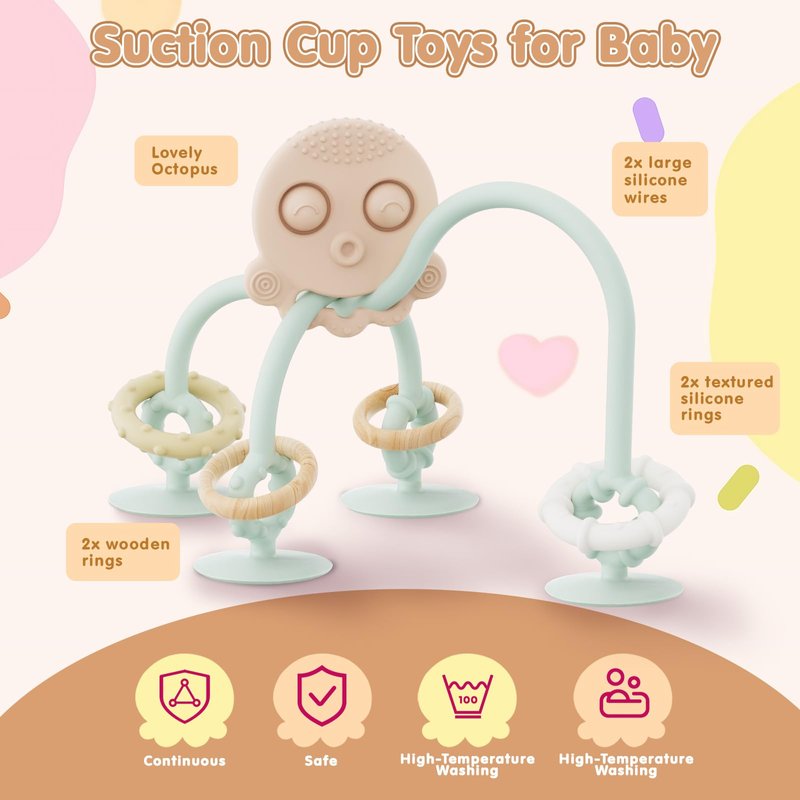 - 【Textured Surface Design on Octopus Head】: Experience the ultimate teething relief with our innovative high chair toy! Octopus head textured surface design gives baby a better teething experience! Crafted with food-grade silicone and high-quality oak rings, our teething toy provides a safe and comfortable solution for baby's teething needs. The smooth and burr-free design ensure maximum safety and comfort. Sized great for tiny hand, our suction toy is suitable for babies aged 3 to 24 months.