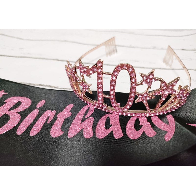Happy 10th Birthday Tiara and Sash Gifts Crystal Rhinestone Princess Crown Birthday Girl Party Favor Supplies Pink Crowns Black Sash