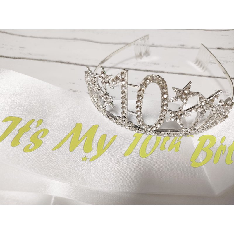 - THE 10th BIRTHDAY KIT INCLUDES - 10th rhinestone crown and glitter " It's My 10th Birthday " birthday sash. It is a wonderful set for girl's 10th party and the crown can still be worn for long after the cake is eaten.