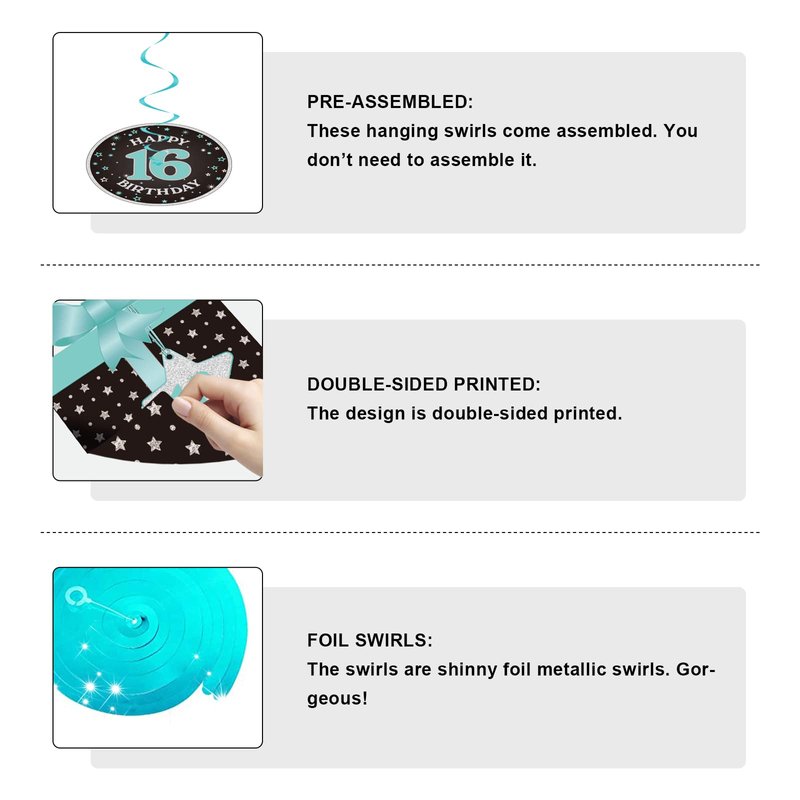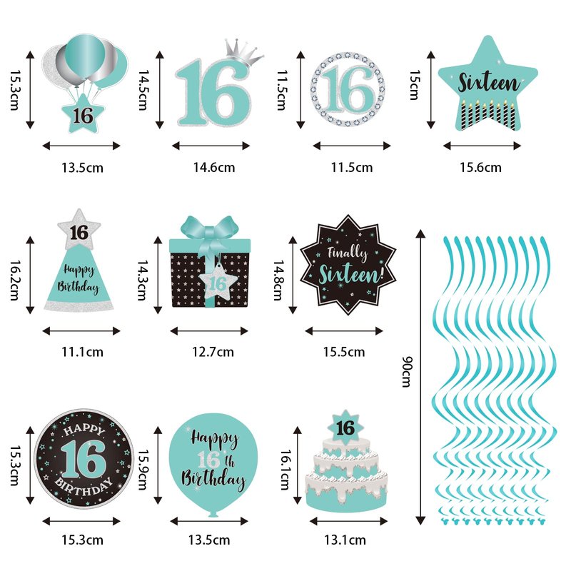 - 16th Birthday Decoration Kit: Comes with total 10 different hanging swirls in the kit. The cutouts are double-sided design in teal silver black blue color. The swirls are shiny metallic foil swirls. There are a variety of birthday element patterns including gift box, hat, cake and other popular patterns