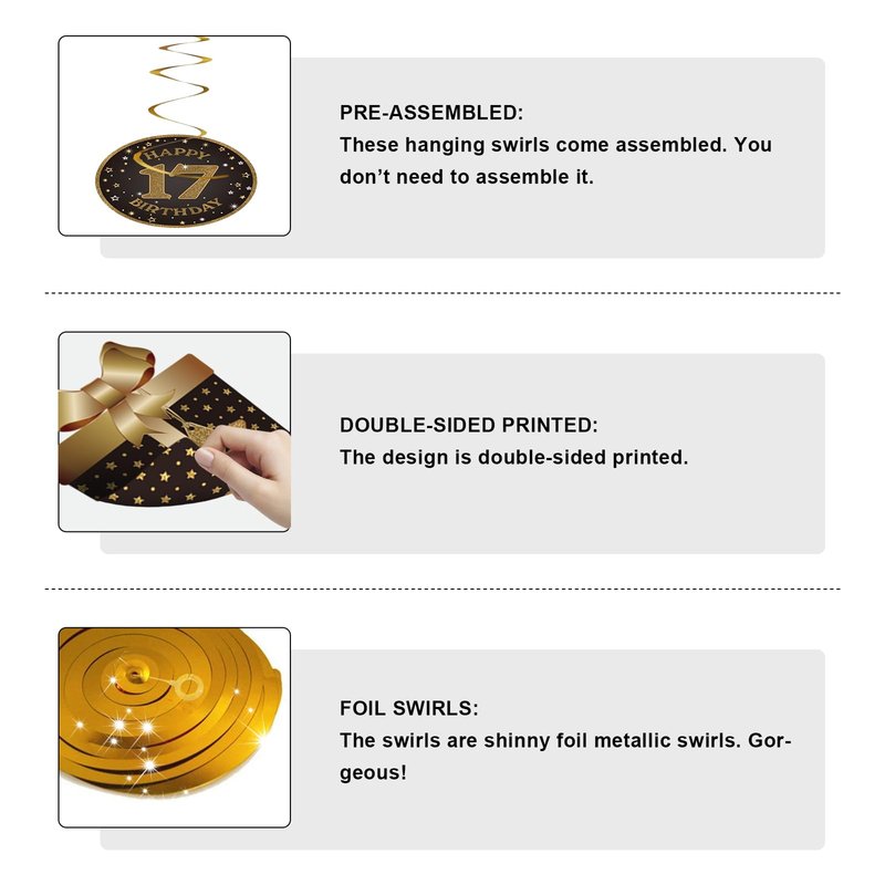 - 17th Birthday Decoration Kit: Comes with total 10 different hanging swirls in the kit. The cutouts are double-sided design in black glitter color. The swirls are shiny metallic foil swirls. There are a variety of birthday element patterns including gift box, hat, cake and other popular patterns…