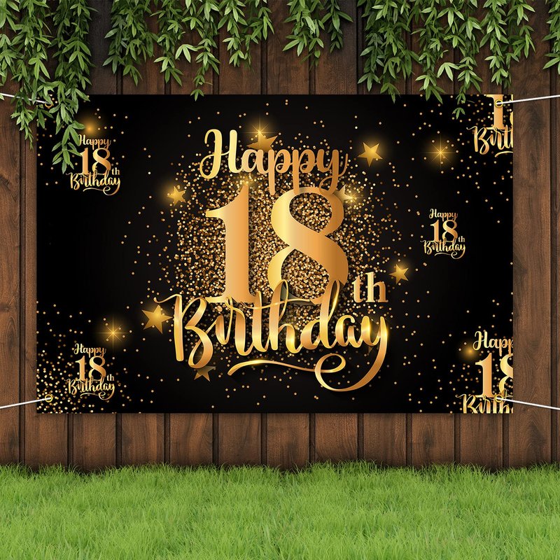 Happy 18th Birthday Backdrop Banner Step and Repeat 18 Years Old Background Decorations for Women Men Her Him Photography Party Supplies Glitter Black Gold