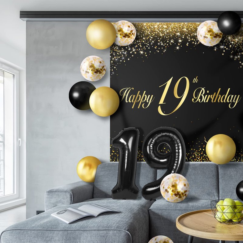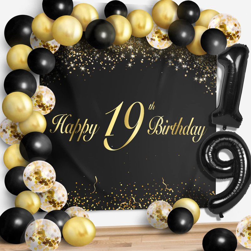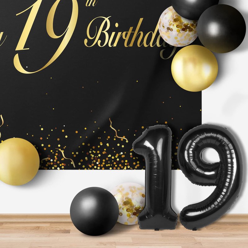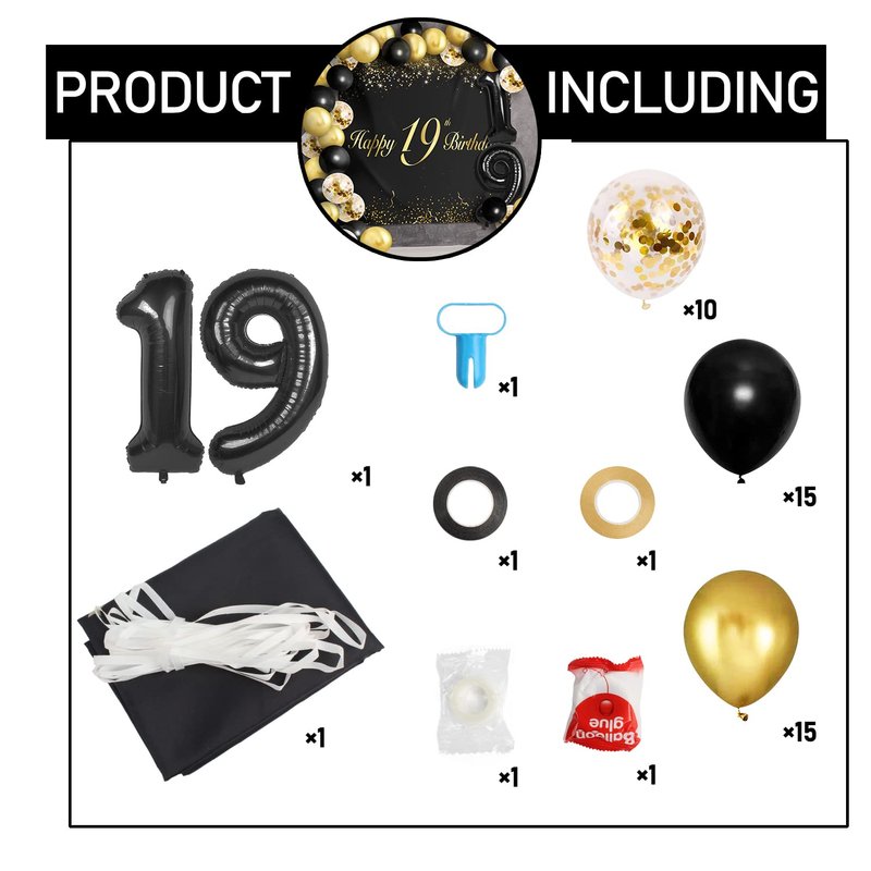 - 🎈 【Birthday Party Decorations】Black birthday decorations include: big 32 Inch 19 numbers, 10Pcs latex balloons, 15Pcs black metal balloons, 15 Pcs gold metal balloons, equipped with 1 glue points, 1 small ribbons, 1 balloon knotter. 1 Pcs 3 X 5.9 ft happy birthday banner backdrop.