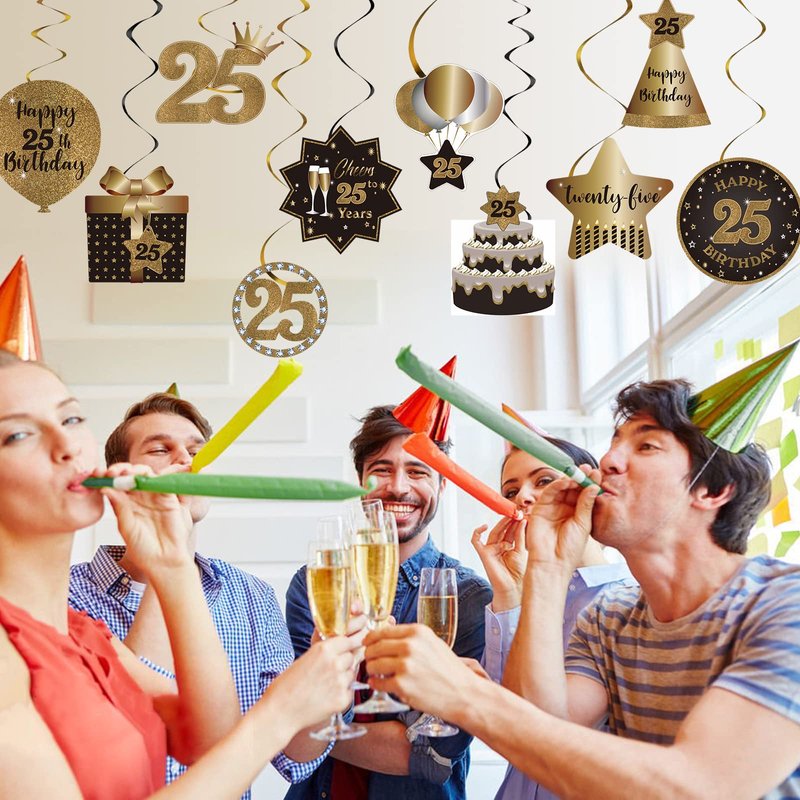 - 25th Birthday Decoration Kit: Comes with total 10 different hanging swirls in the kit. The cutouts are double-sided design in black and glitter gold color. The swirls are shiny metallic foil swirls. There are a variety of birthday element patterns including gift box, hat, cake and other popular patterns…