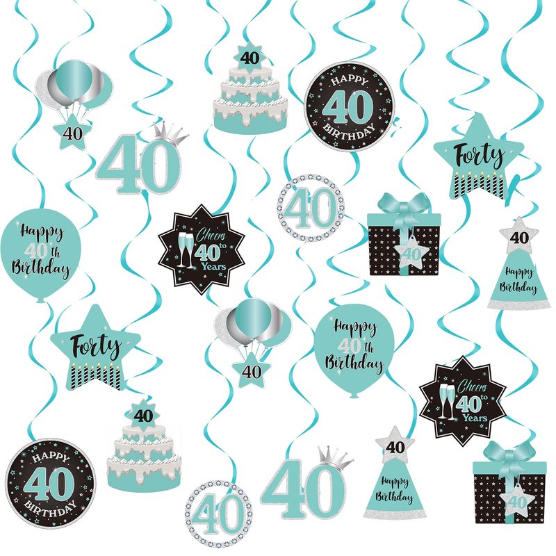 - 40th Birthday Decoration Kit: Comes with total 20 different hanging swirls in the kit. The cutouts are double-sided design in teal silver black blue color. The swirls are shiny metallic foil swirls. There are a variety of birthday element patterns including gift box, hat, cake and other popular patterns