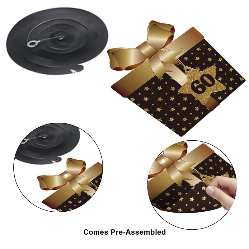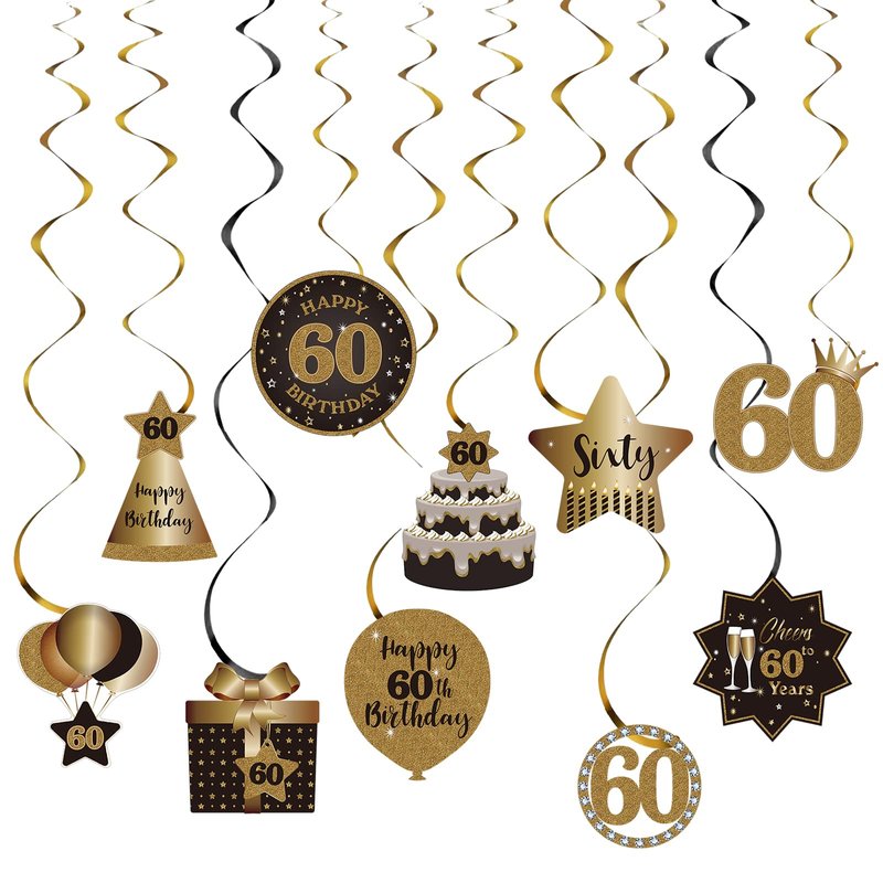 - 60th Birthday Decoration Kit: Comes with total 10 different hanging swirls in the kit. The cutouts are double-sided design in black and glitter gold color. The swirls are shiny metallic foil swirls. There are a variety of birthday element patterns including gift box, hat, cake and other popular patterns…
