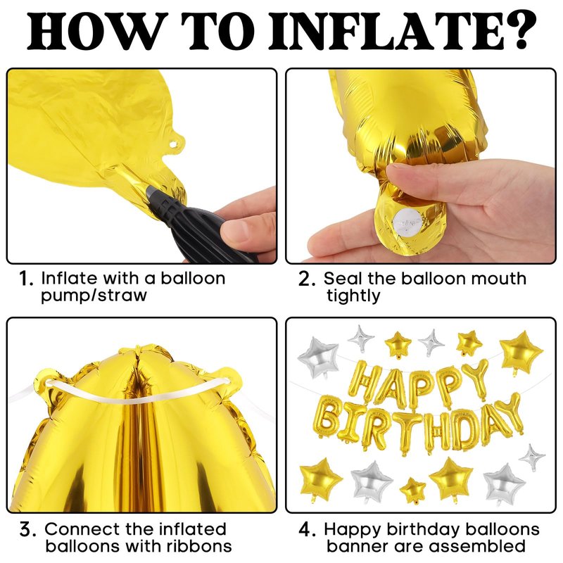 Package Includes: 1 set happy birthday balloons, 3 pcs 10inches four-pointed star balloons, 3 pcs 10inches five-pointed star balloons, 6pcs 18inches five-pointed star balloons, 1pcs straw, 1pcs ribbon.