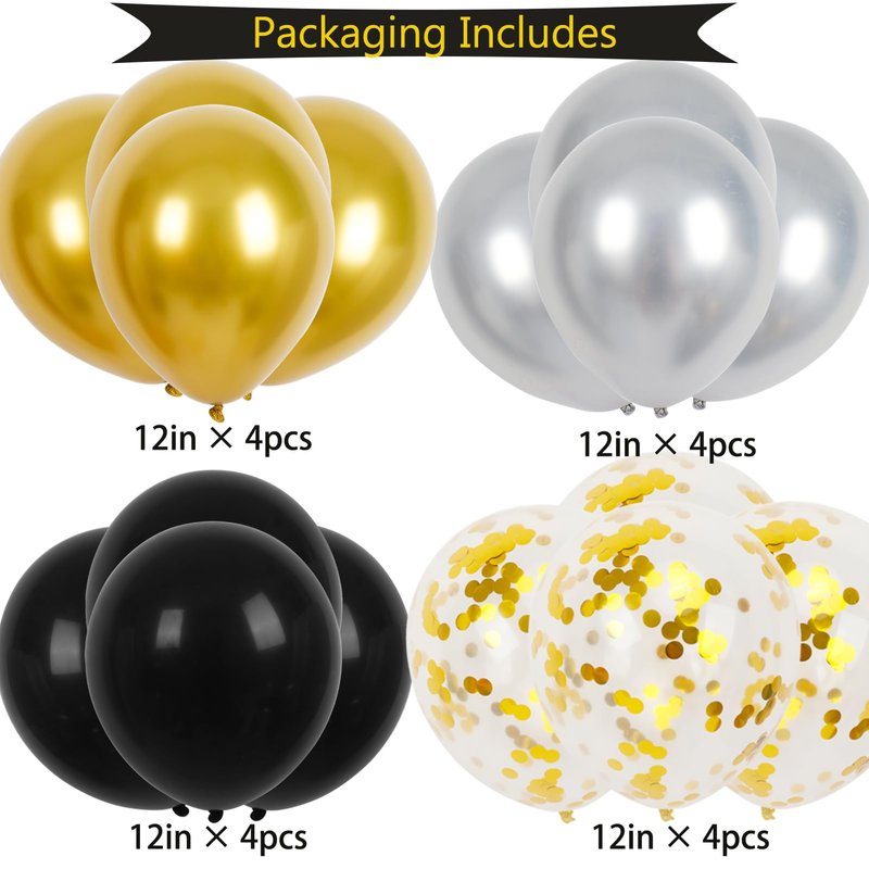 - Birthday Decorations Set: Black happy birthday banner + 4 x 12 inch black latex balloons + 4 x 12 inch gold confetti latex balloons + 4 x 12 inch gold metallic balloons + 4 x 12 inch silver metallic balloons + 2 rolls of ribbon, the perfect birthday decorations to bring you a unique and wonderful party.