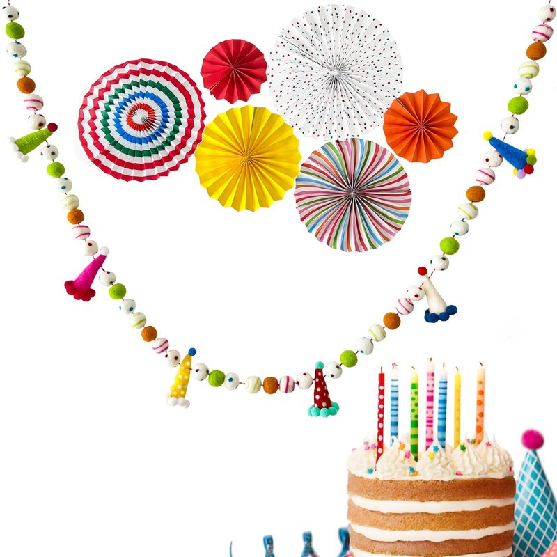 - 【RAINBOW PARTY DECORATIONS】: Our HAPPY BIRTHDAY felt ball garland is the perfect accent for birthday party decor, childrens bedroom, kids teepee, playhouse, playroom or home decor. Our Birthday Candles Garland comes in a vibrant rainbow color that will brighten up any space.You can place these adorable birthday party hat garlands on your mantel, dining room, playroom, or anywhere else in your home to add a pop of color.