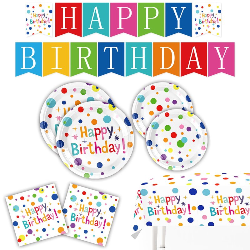 Happy Birthday Party Supplies Set with Birthday Dots Design- Includes Disposable Paper Birthday Plates and Napkins, Cups, Tablecloth