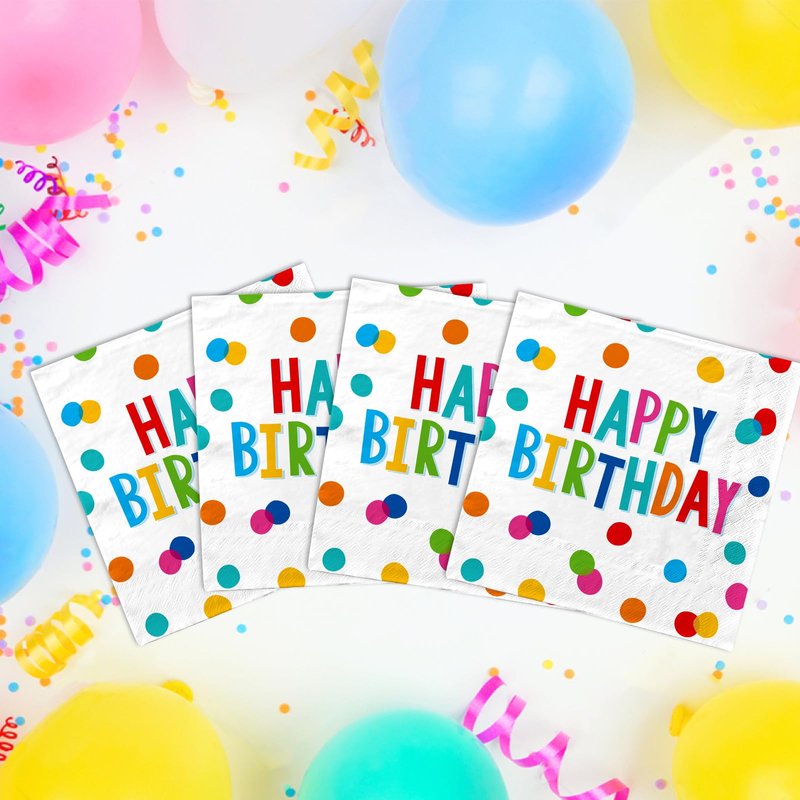 - Birthday Design: These three-ply paper napkins feature a vibrant "HAPPY BIRTHDAY" headline against a backdrop of multicolored dots. Perfect for adding a fun touch to your happy birthday decorations.