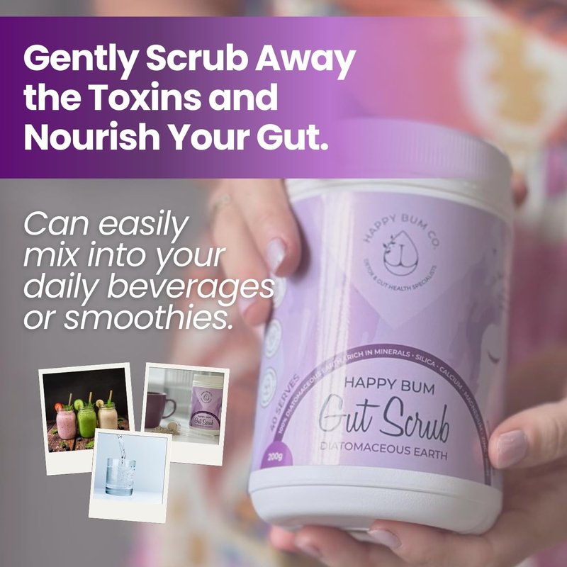 Happy Bum Gut Scrub - Diatomaceous Earth Food Grade for Humans | Mineral Powder Supports Gut Health, Bloating Relief | Rich in Silica, Zinc & Minerals for Healthy Hair, Skin, Nail - 200g