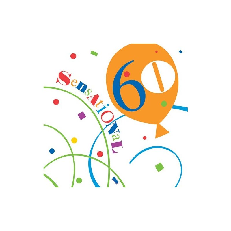 60th birthday party Happy Day Lunch Napkins matching our Happy Day party decorations. Each napkin says "Sensational 60" on both sides. Strong 2-ply napkins, sold 18 per package.