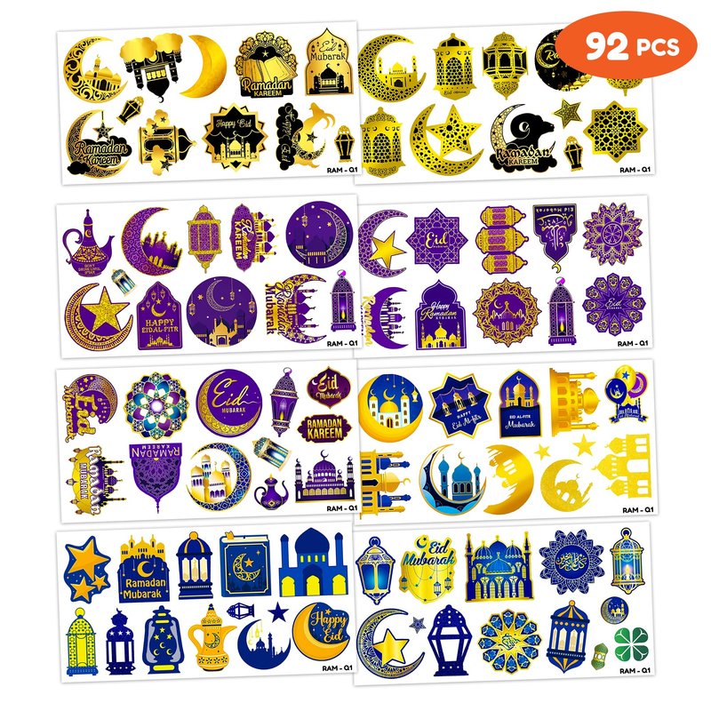 - Happy Eid Al Adha Ramadan Kareem Eid Mubarak Party Decoration: The set contains instructions for use and is easy to use. Happy Ramadan tattoo stickers can be applied on arms, face, hands, neck, shoulders, legs, wrists and ankles to make you look cool at all kinds of parties. Popular hit with your kids. You can apply them to your body or some smooth objects, for example, glass, stationery, paper, crafts cups, cabinet, bottle.