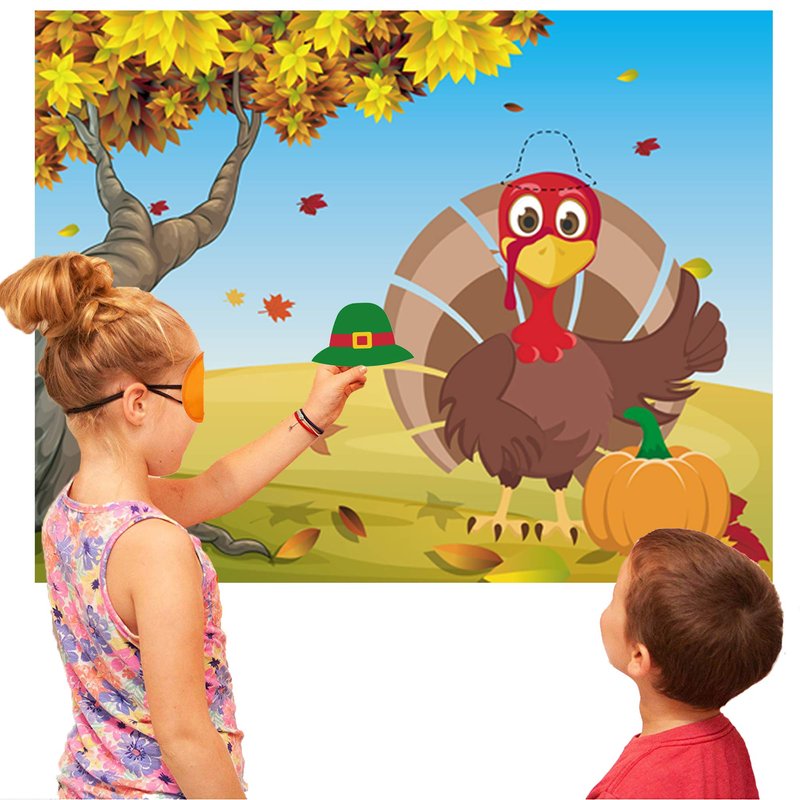 - PIN THE HAT ON THE TURKEY PACKAGE INCLUDED: 1 Pcs Pin the Hat on the Turkey Game poster, 24 Pcs colorful hat stickers, 1 Pcs orange eye mask, 1 Pcs Pin the Hat on the Turkey Game instructions, 1 Pcs Thanksgiving pin game poster cover, 8 Pcs dot glues. Perfect for Thanksgiving Party Games, Thanksgiving Party Decorations, Thanksgiving Birthday Party, Classroom Party Game Activities.