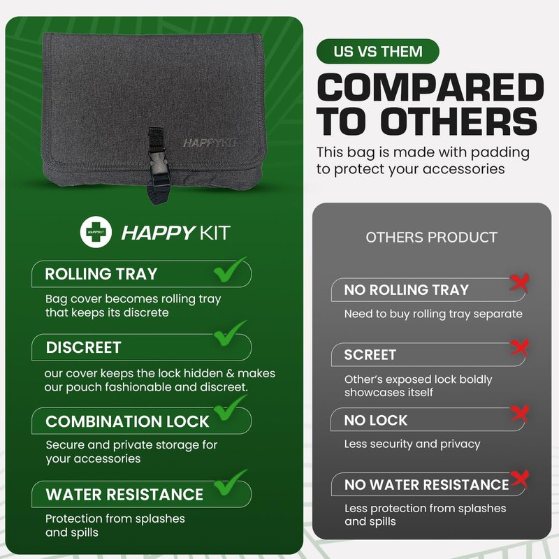 Welcome to our ultimate accessory organizer Happy Pouch! The water proof container protects everything inside, so you can conveniently throw it in your backpack and find yourself ready for happy times! Our scent proof bag has a full carbon lining that prevents any sort of scent from escaping out. And its waterproof design keeps all your dry items from getting soaked inside. Moreover, it comes with a 3-digit combination lock that keeps your accessories safe, so it's a perfect choice.