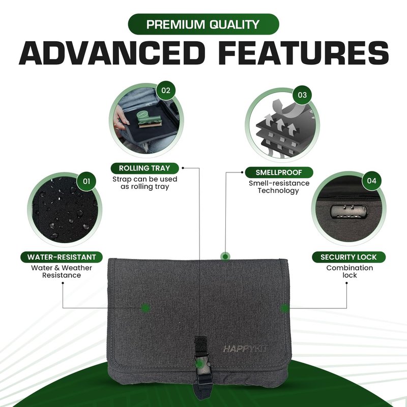 - [ SAFE AND SECURE ] - The Happy pouch has a full carbon lining, the front flap doubles as a rolling tray, and is secured with a 3-digit combination lock to give you a safe place to store your favorite accessories with no worries