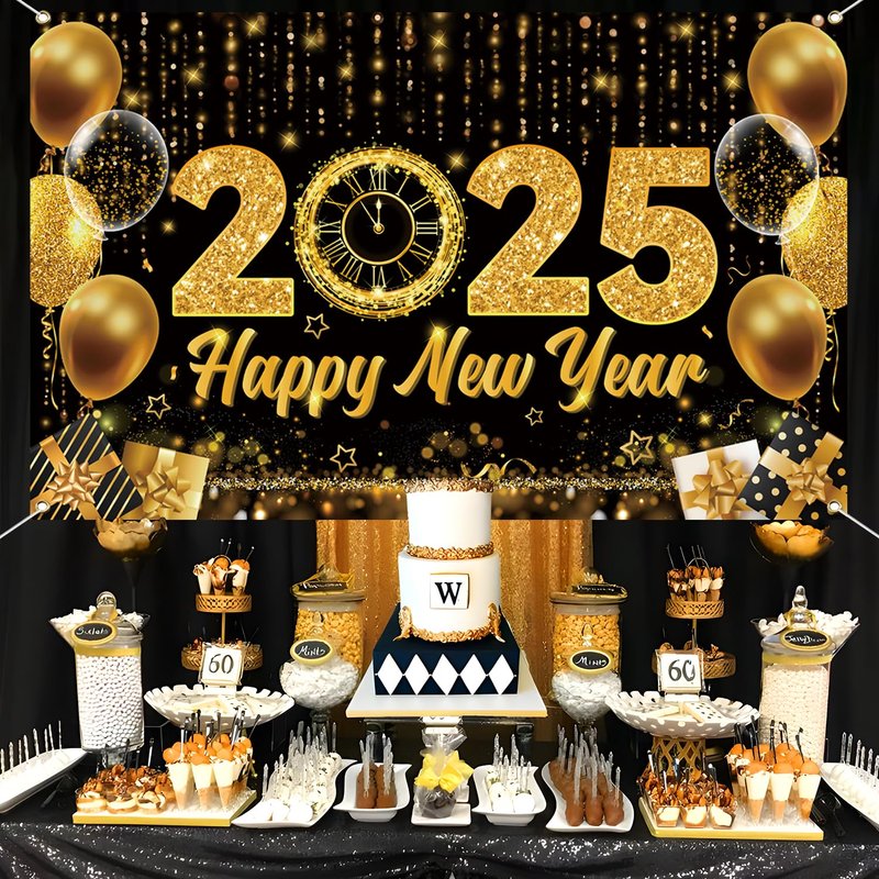 2025 New Year Backdrop Black Gold New Year Eve Banner for Party Decorations Supplies