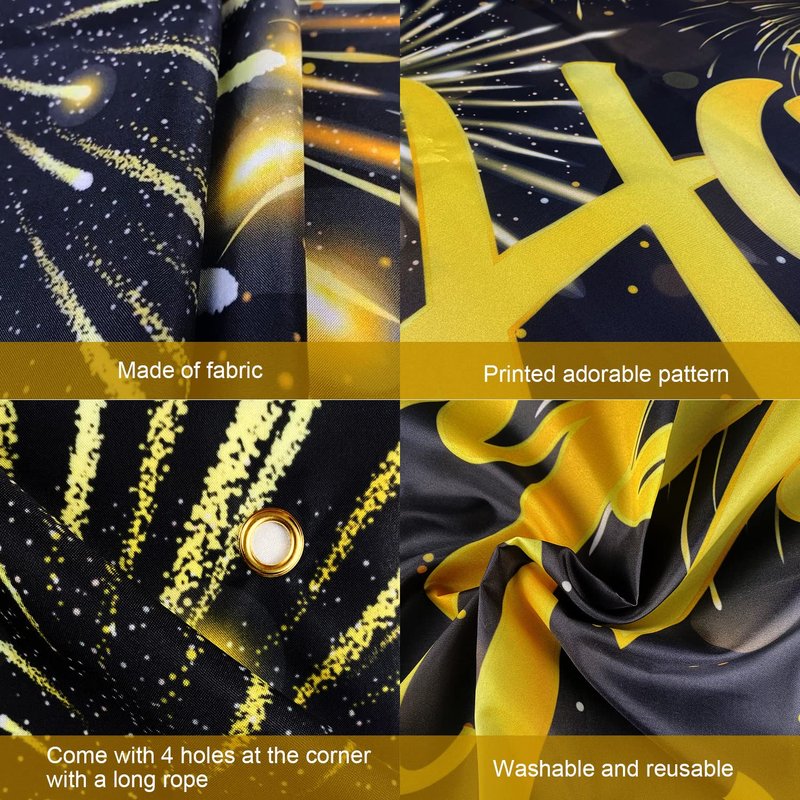 - LARGE BANNER SIZE: The new years backdrop is 43X71 inches, perfect for a New Years party, the oversized happy new year lettering makes the party theme clear at a glance, even from a distance. You can take pictures with your family and friends under this black and gold New Year's banner.