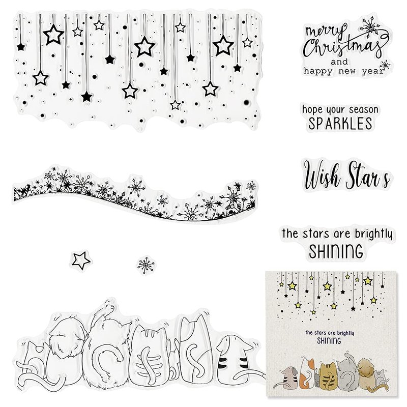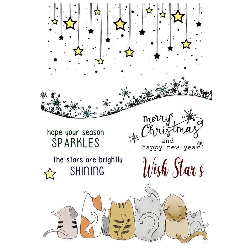 - 5.Packaging Includes: 1 sheet clear stamps.Contains 9 clear stamps.1*Star frame,1*Snowflake frame ,1*Star,1*Snowflake,1*Cats, 4*Sentiment words.The overall size is 16.2 x 11.4cm.Perfect for you DIY craft.Different shape for your different need.