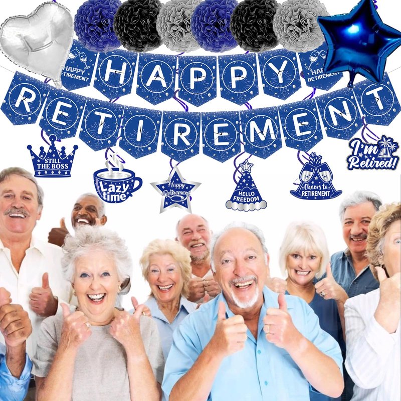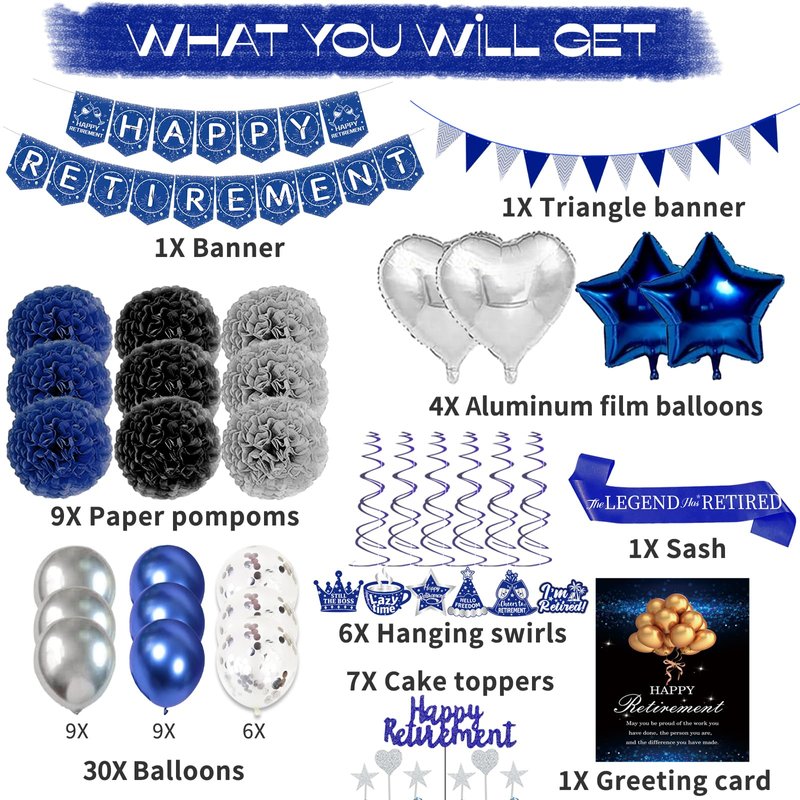 - Retirement Party Decorations for Men Package: Everything you need in retirement party supplies set: 1x happy retirement banner, 1 x triangle banners, 18 x latex retirement balloons, 6 x confetti balloons, 4 x foil balloons, 1x retirement greeting card, 1 x greeting card clip, 6 x hanging swirls, 6 x flowers pom poms, 7 x cake toppers, 1 x sash, 1 x ribbons, 1 x glue dots, 1 x straw.
