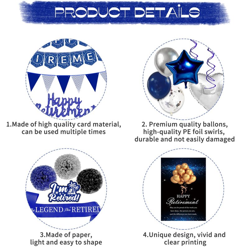 - High Quality After-sales Service: We have been committed to bringing customers a good shopping experience. If you have any dissatisfaction after receiving our blue and silver retirement decorations, please do not hesitate to contact us, we will give you the most satisfactory answer. Hope you will like our retirement party decorations for men.